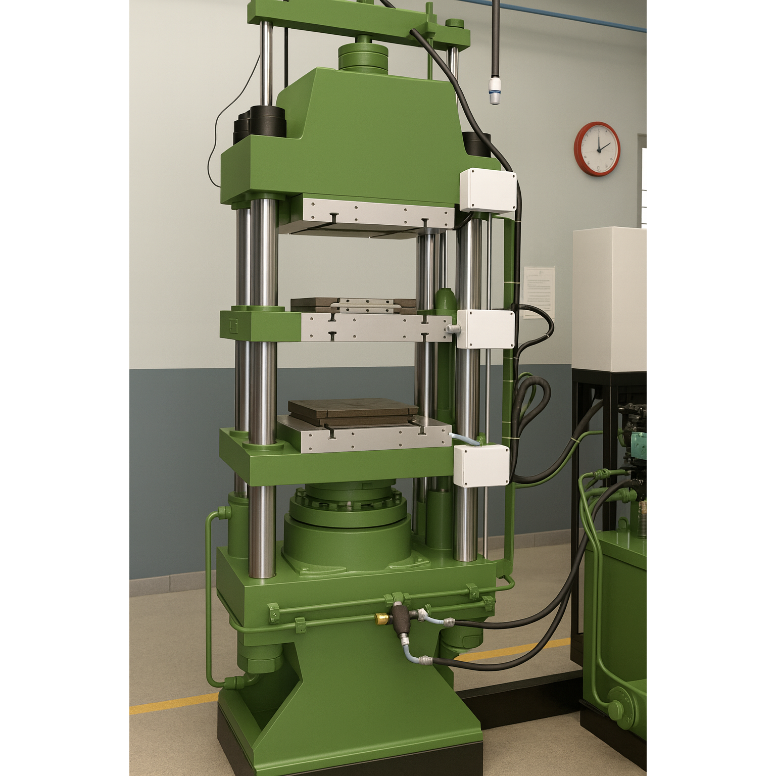 Rubber moulding requires precise temperature, pressure, and timing to produce high-performance parts used in demanding environments. The double-daylight configuration allows two mould sets to operate simultaneously, doubling productivity without compromising quality.